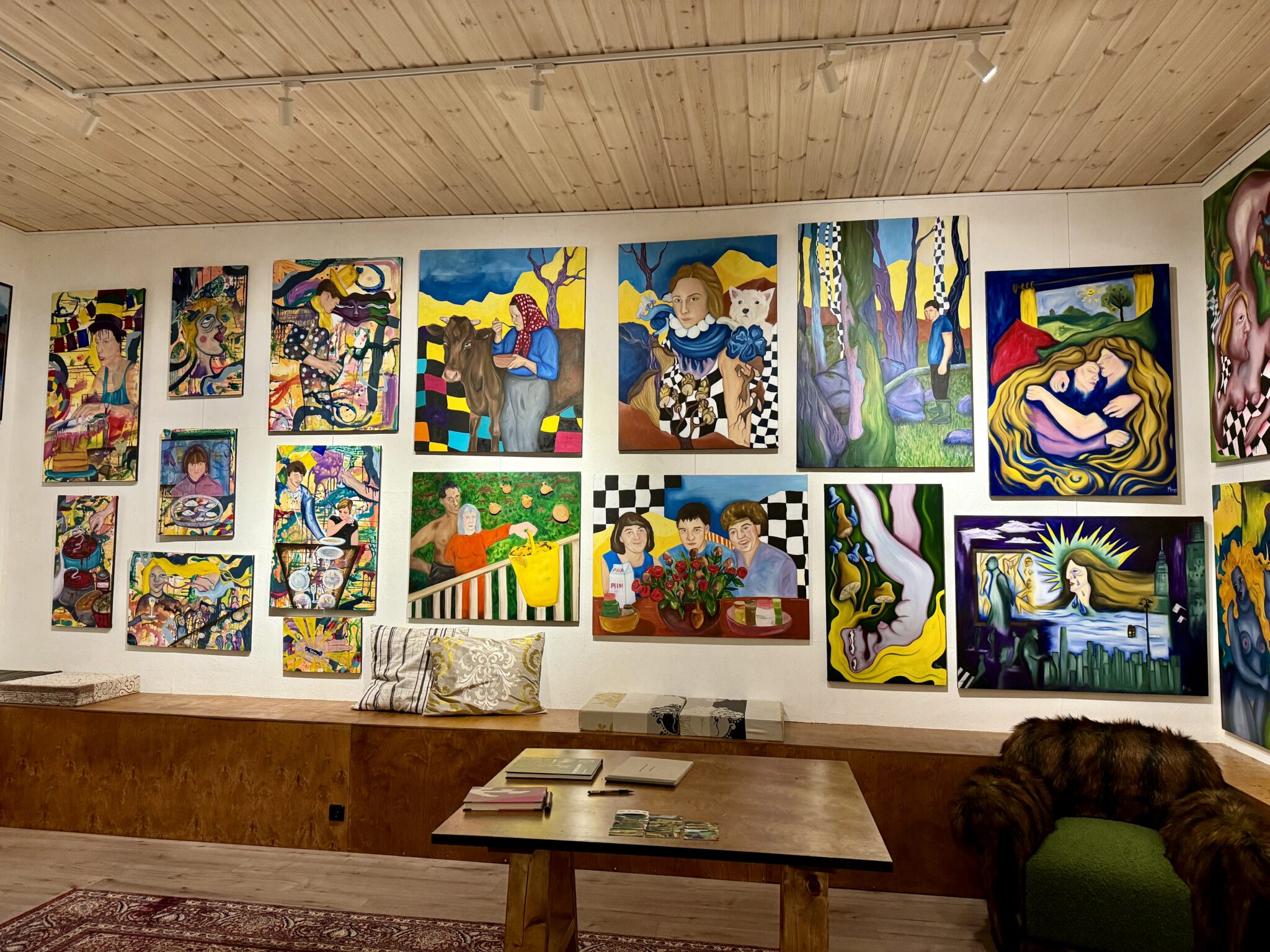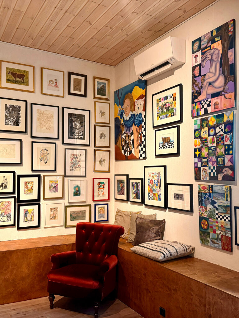 Tegu on ääretult hubase ruumiga, kus on üleval Eesti maali- ja graafikakunstnike teosed ning Mia Melanie Saare värvikirevad ja naivistlikud teosed.