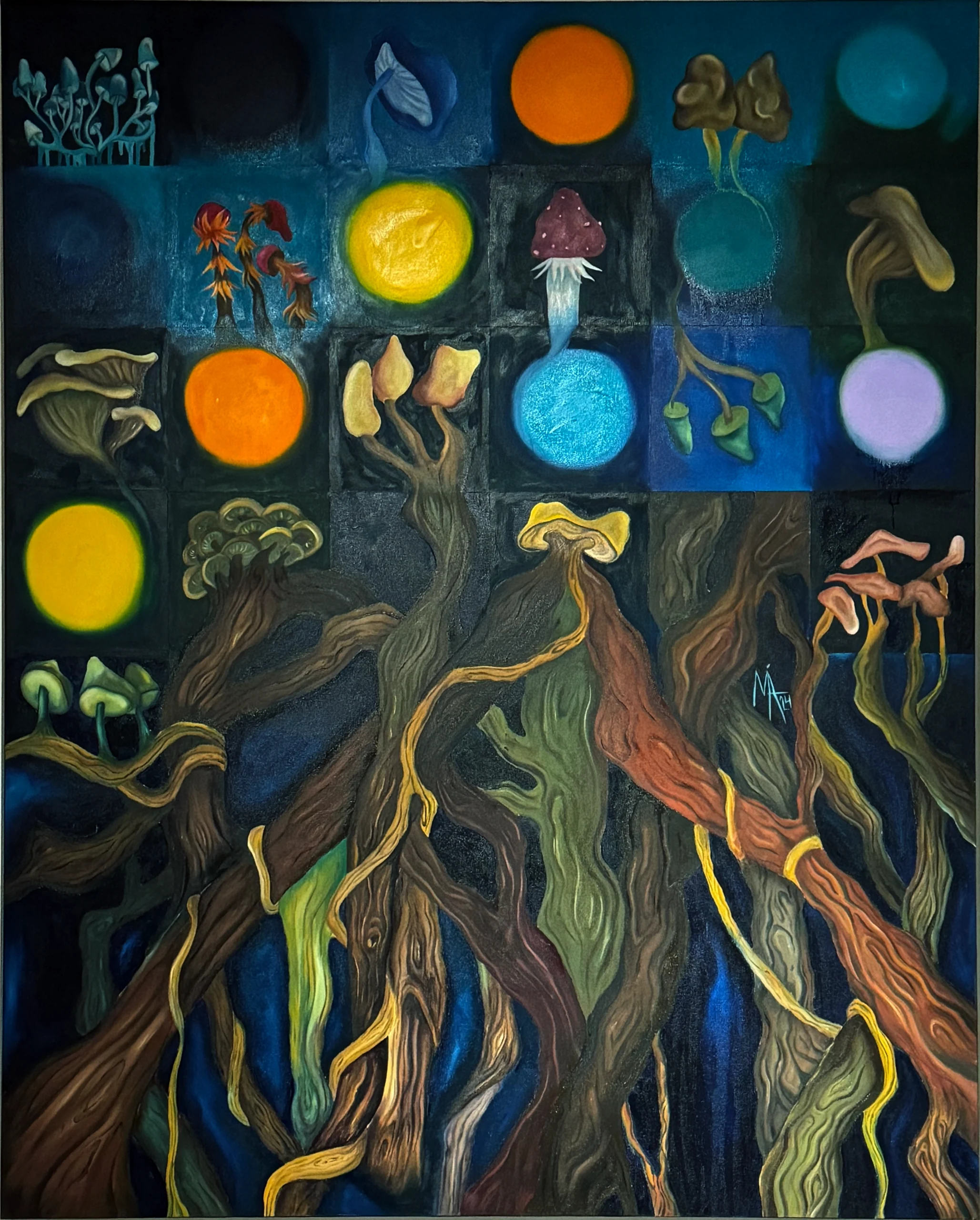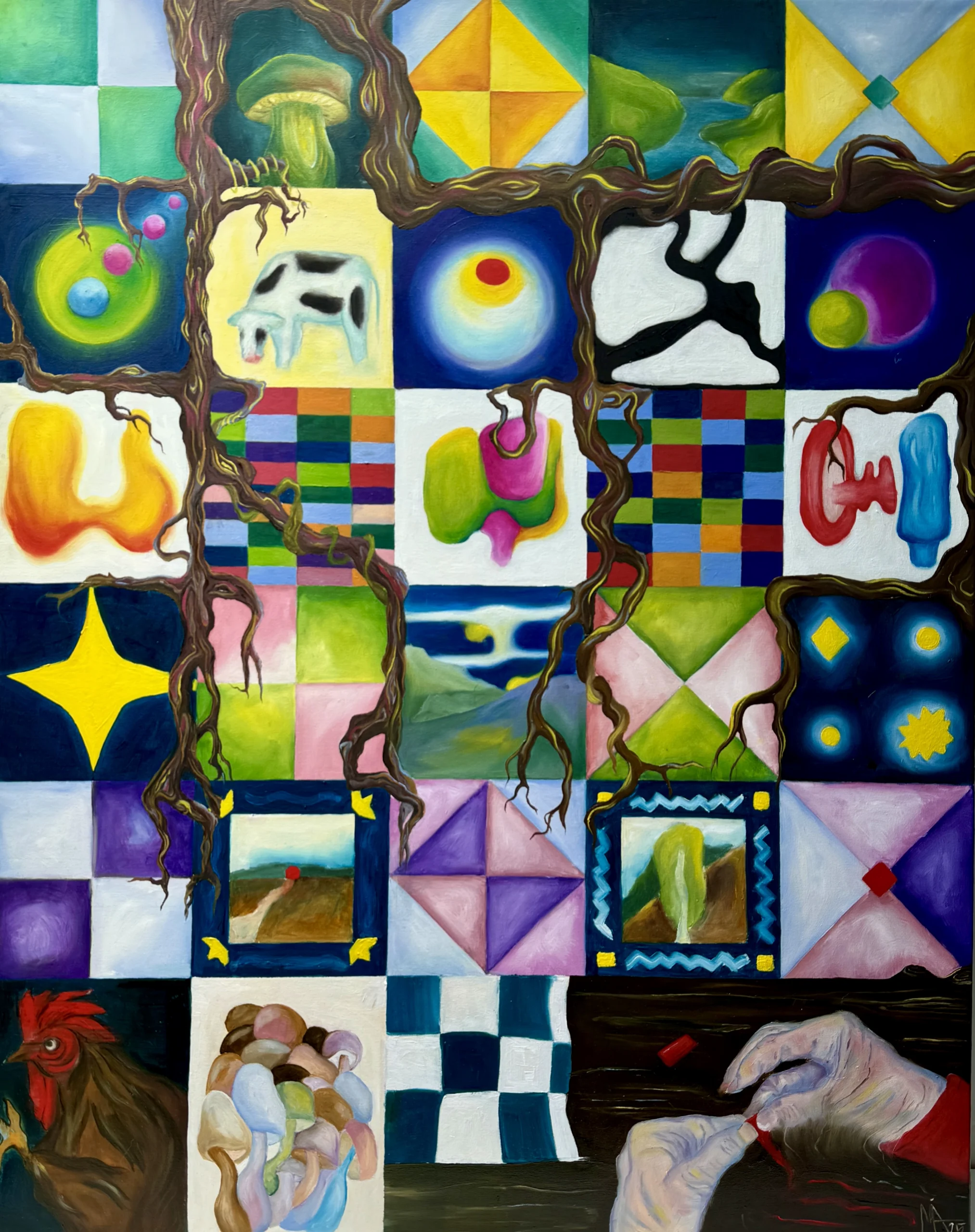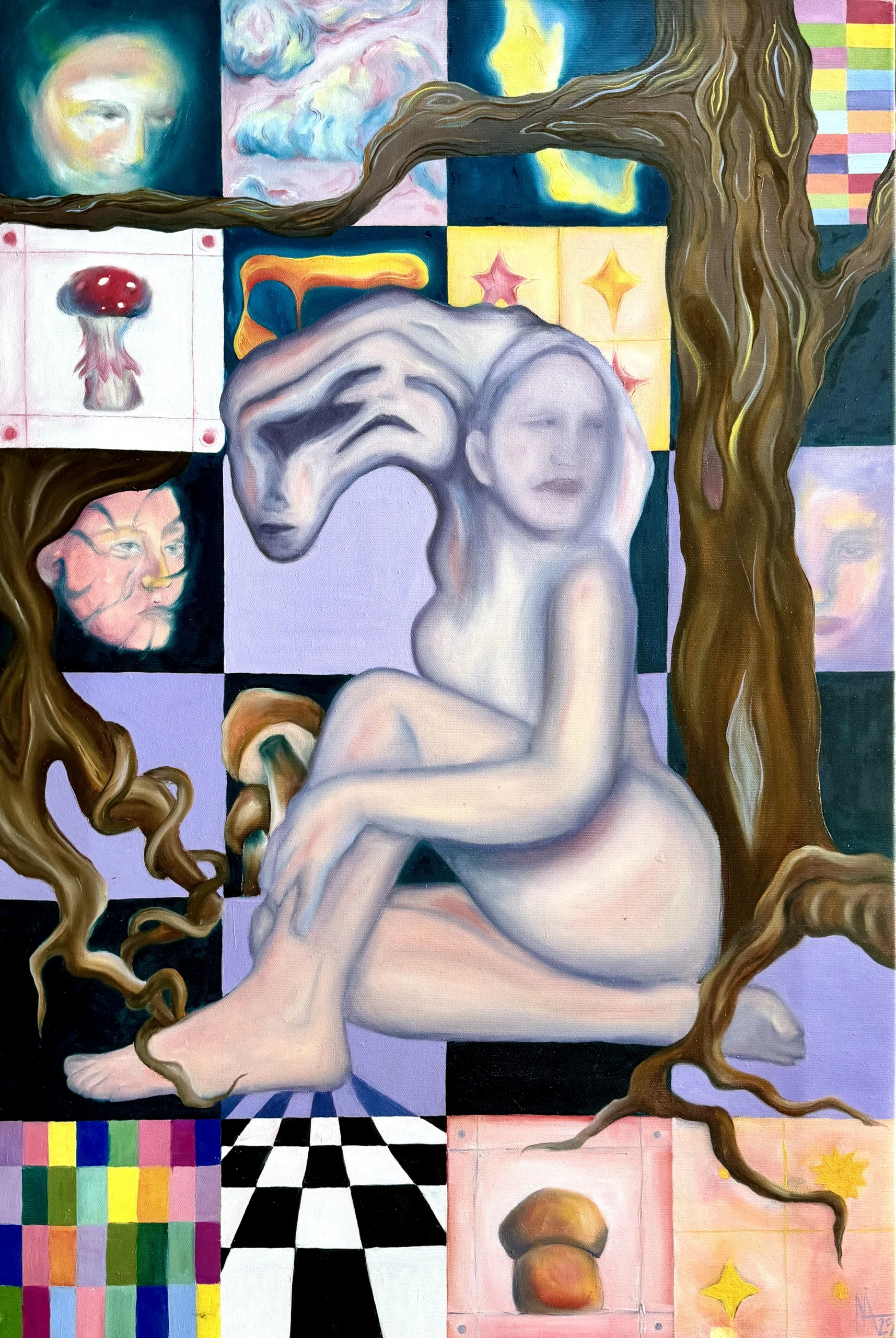 "Stuck between roots and patterns" oil on canvas, 90x60 cm, 2025