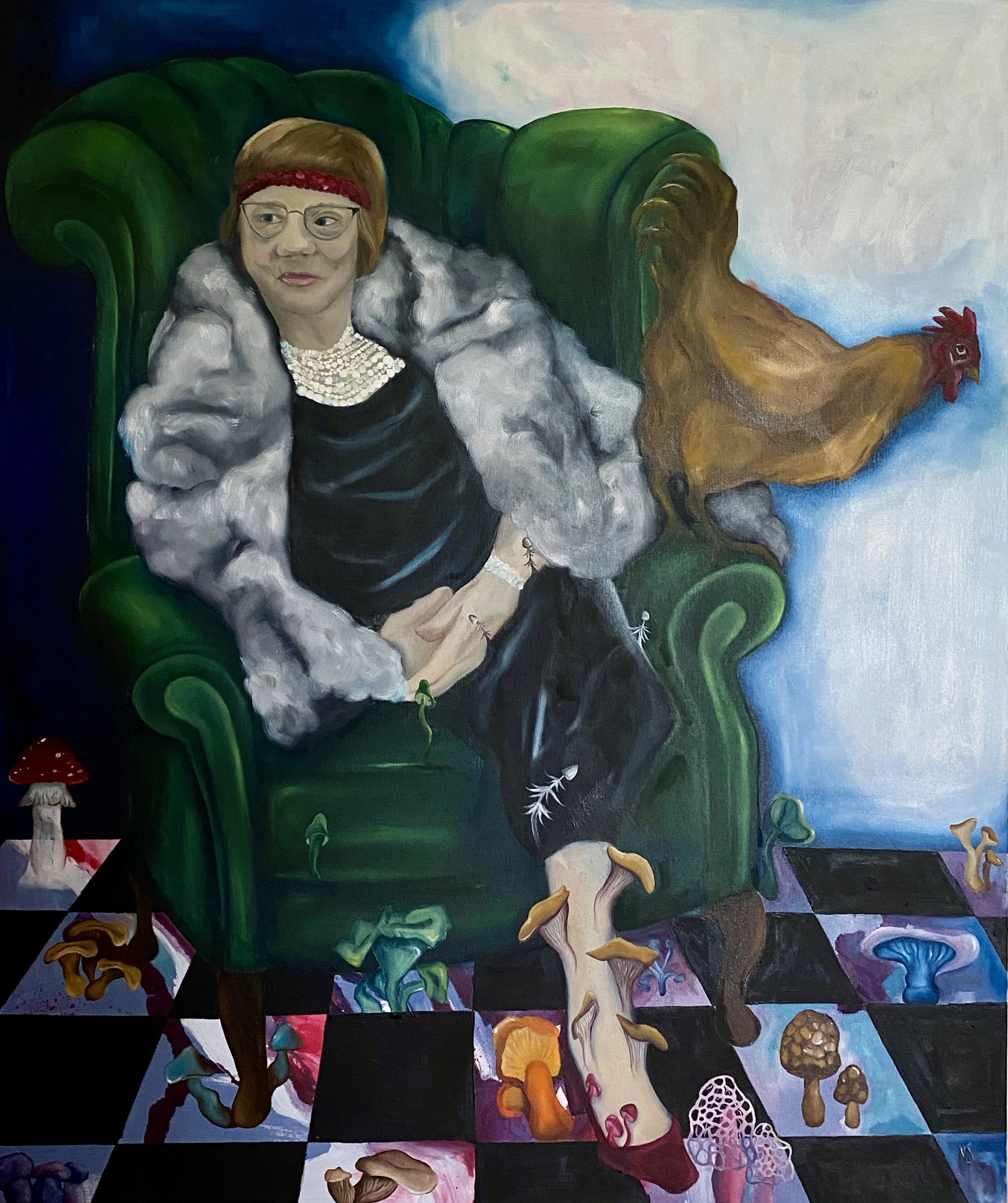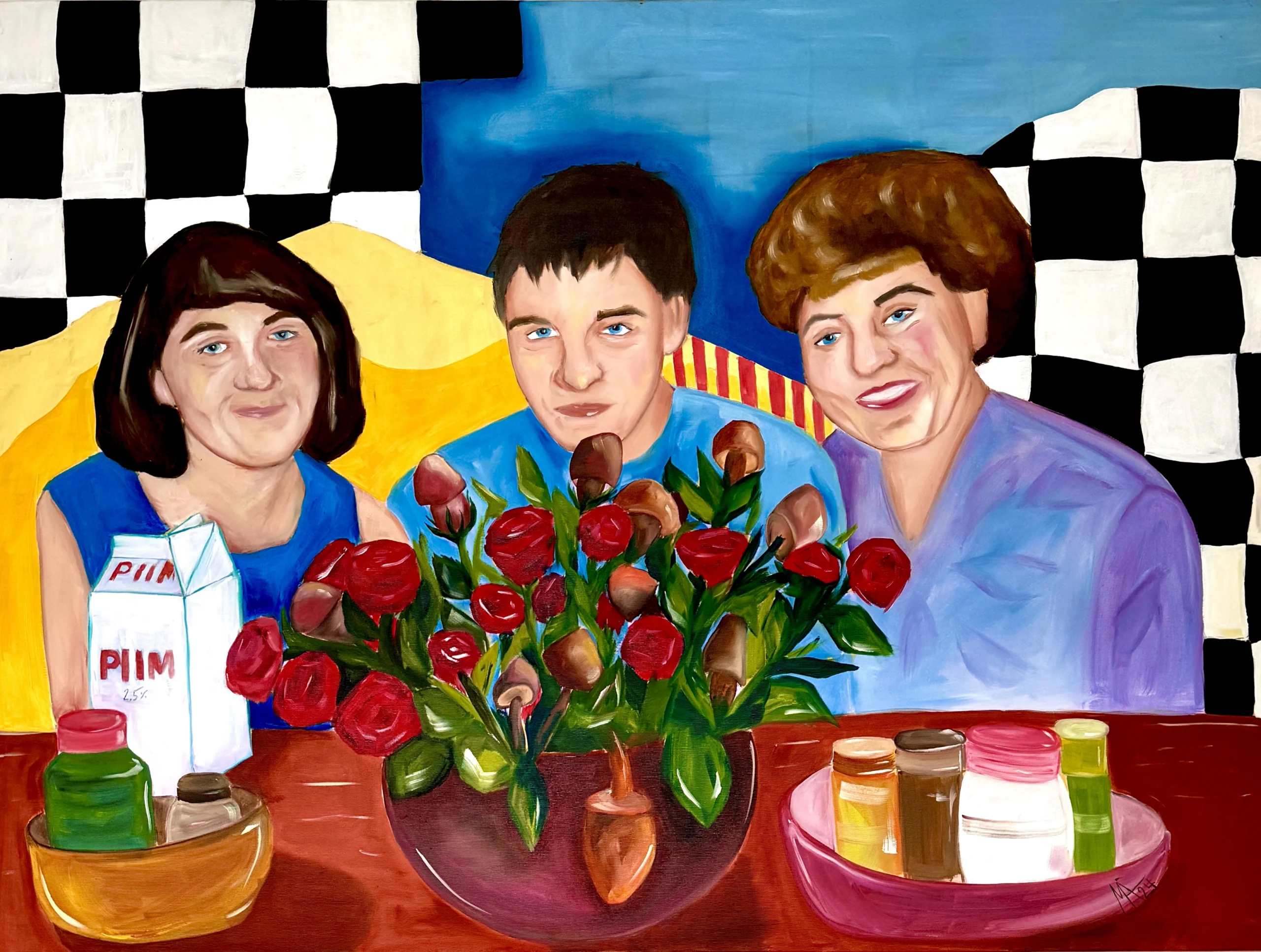 "Roosid ja seened", oil on canvas, 120x89 cm, 2024
